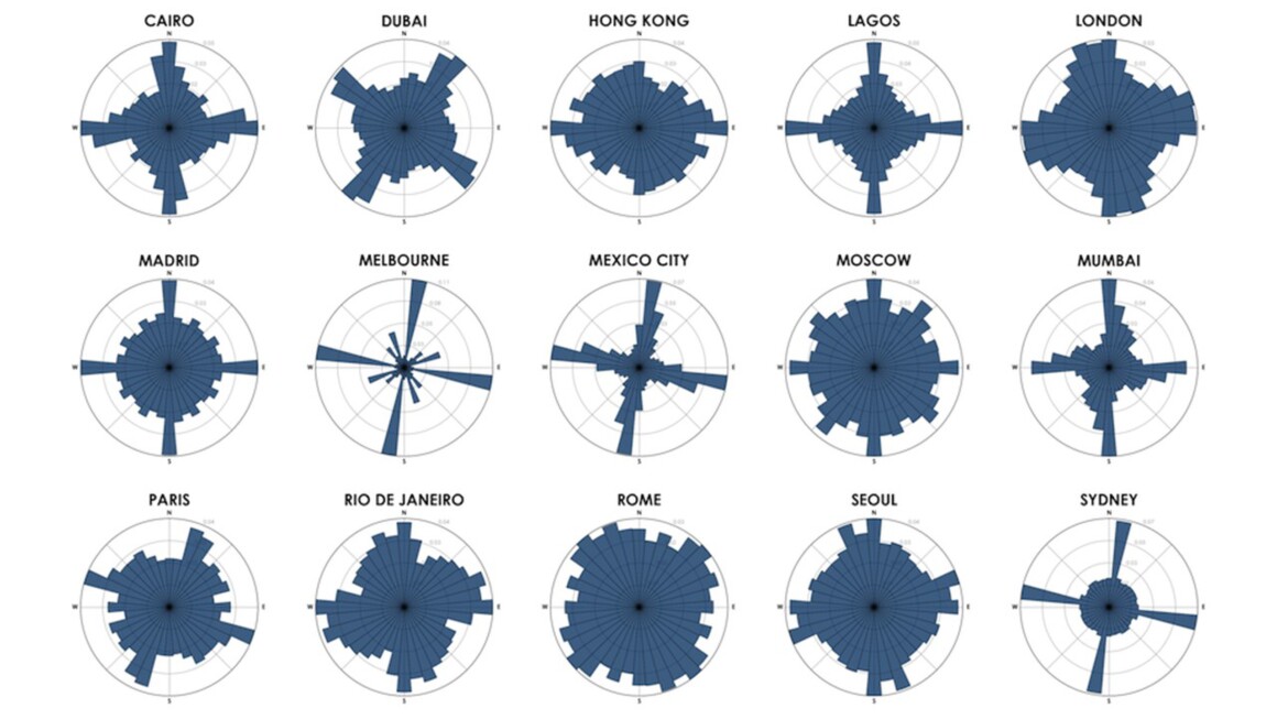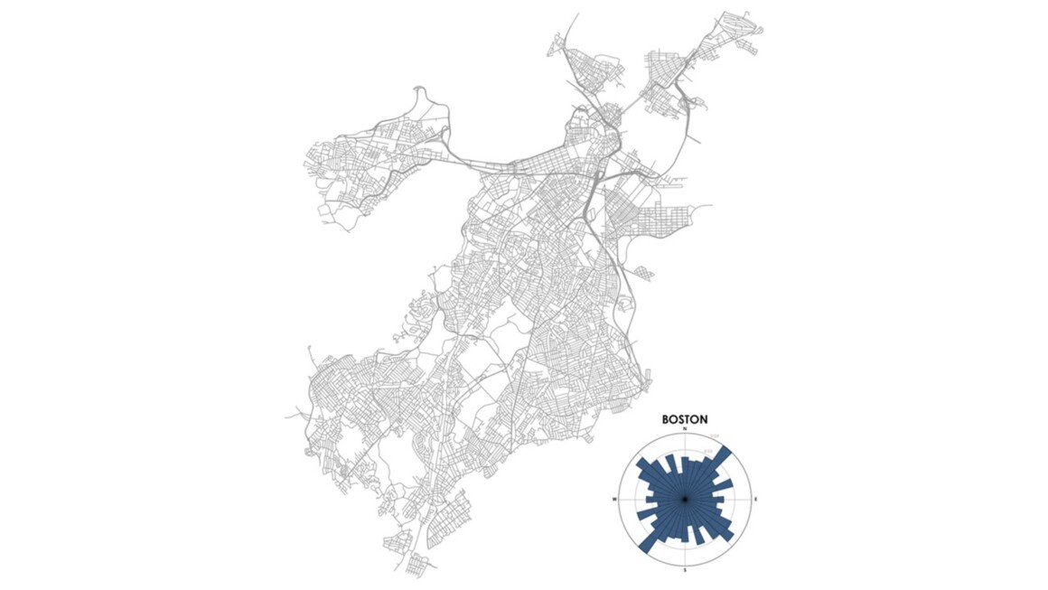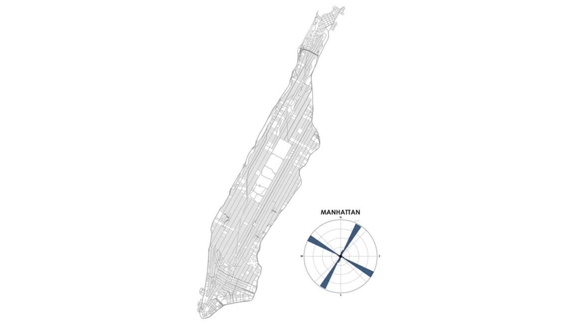 Funciona utilizando una vieja técnica de geografía: la carta "polar" o circular. La herramienta de Boeing calcula qué porcentaje de las carreteras y calles de una ciudad corren a lo largo de cada sección de una brújula y lo traza en un gráfico de barras circulares. La isla de Manhattan, por ejemplo, corre de sur-suroeste a nor-noreste, y la mayoría de sus calles son paralelas o perpendiculares a la isla en una cuadrícula regular. El programa de Boeing visualiza eso como cuatro barras largas, con varias barras más cortas que representan la minoría de calles del municipio que no se alinean con la cuadrícula, como se ilustra en el patrón circular a continuación.