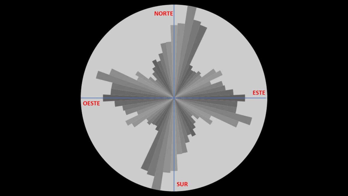 La gráfica polar de nuestra ciudad muestra una tendencia superior con las calles que corren en dirección norte-noreste a sur-suroeste y un tanto menor, a las que corren de oeste-noroeste a este-sureste. Lo que muestra una traza de diseño, es decir, no orgánica. Sin embargo, existe un grupo de calles que aún y siendo de menor cuantía, corren de noreste a suroeste.